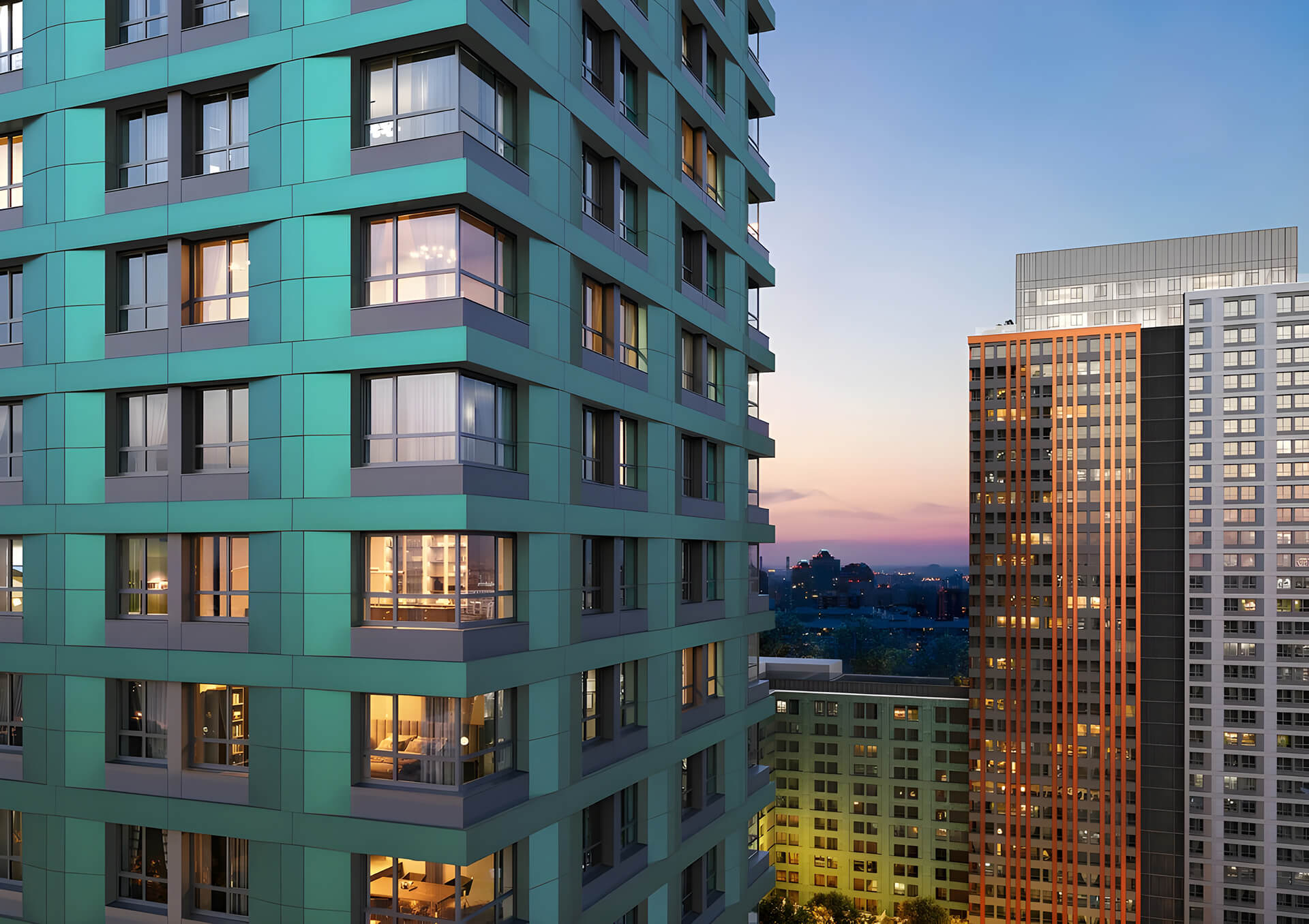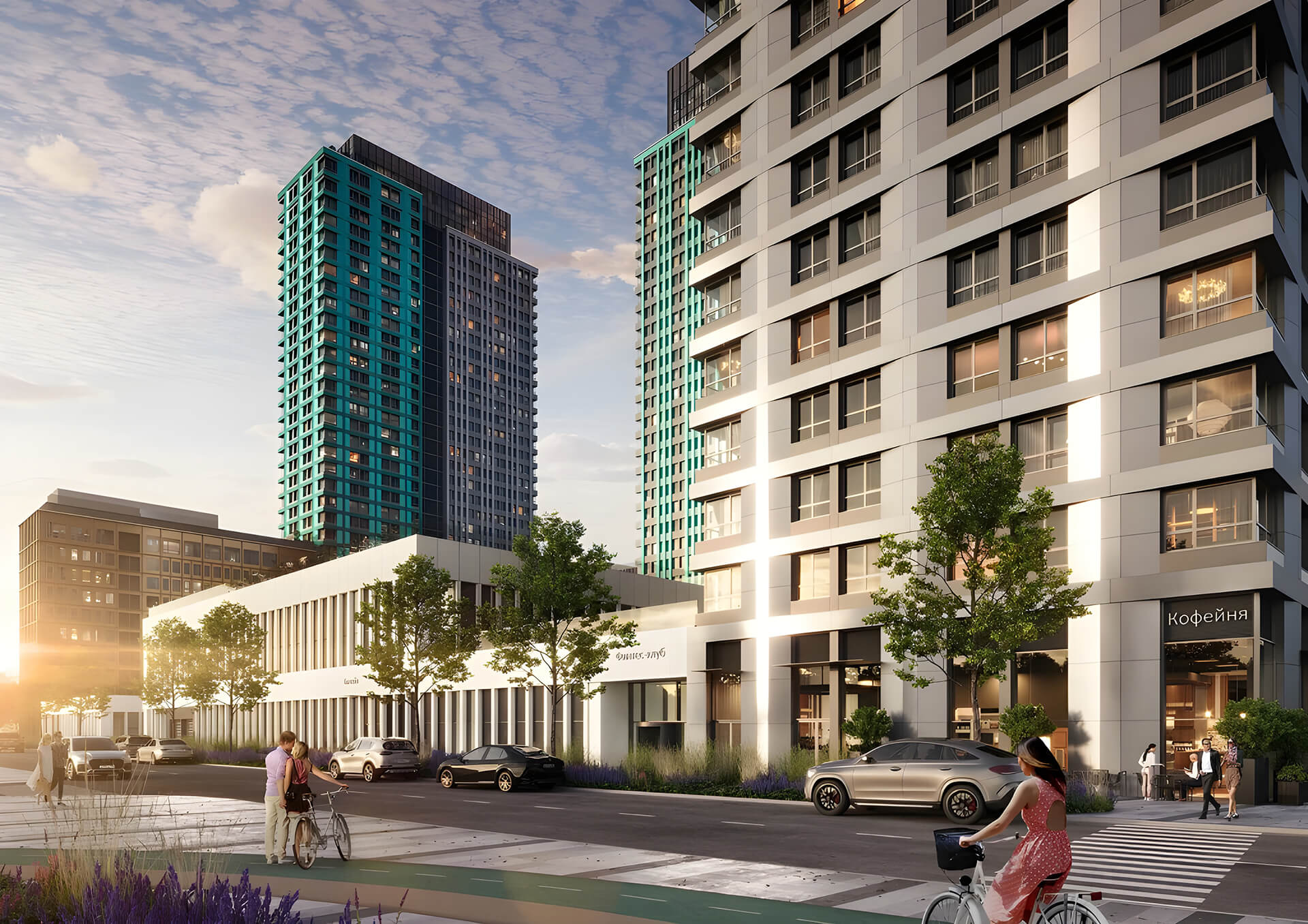 Отдельное внимание уделено входным группам и уличному активному фасаду: архитектура продумана не только как внешний образ, но и как функциональная составляющая среды. Просторные входы, мягкий свет, безбарьерная среда, видеонаблюдение, уникальные элементы освещения и уличной мебели — всё это создаёт не просто жилой дом, а полноценный архитектурный ансамбль, отражающий философию «умного» и комфортного города.