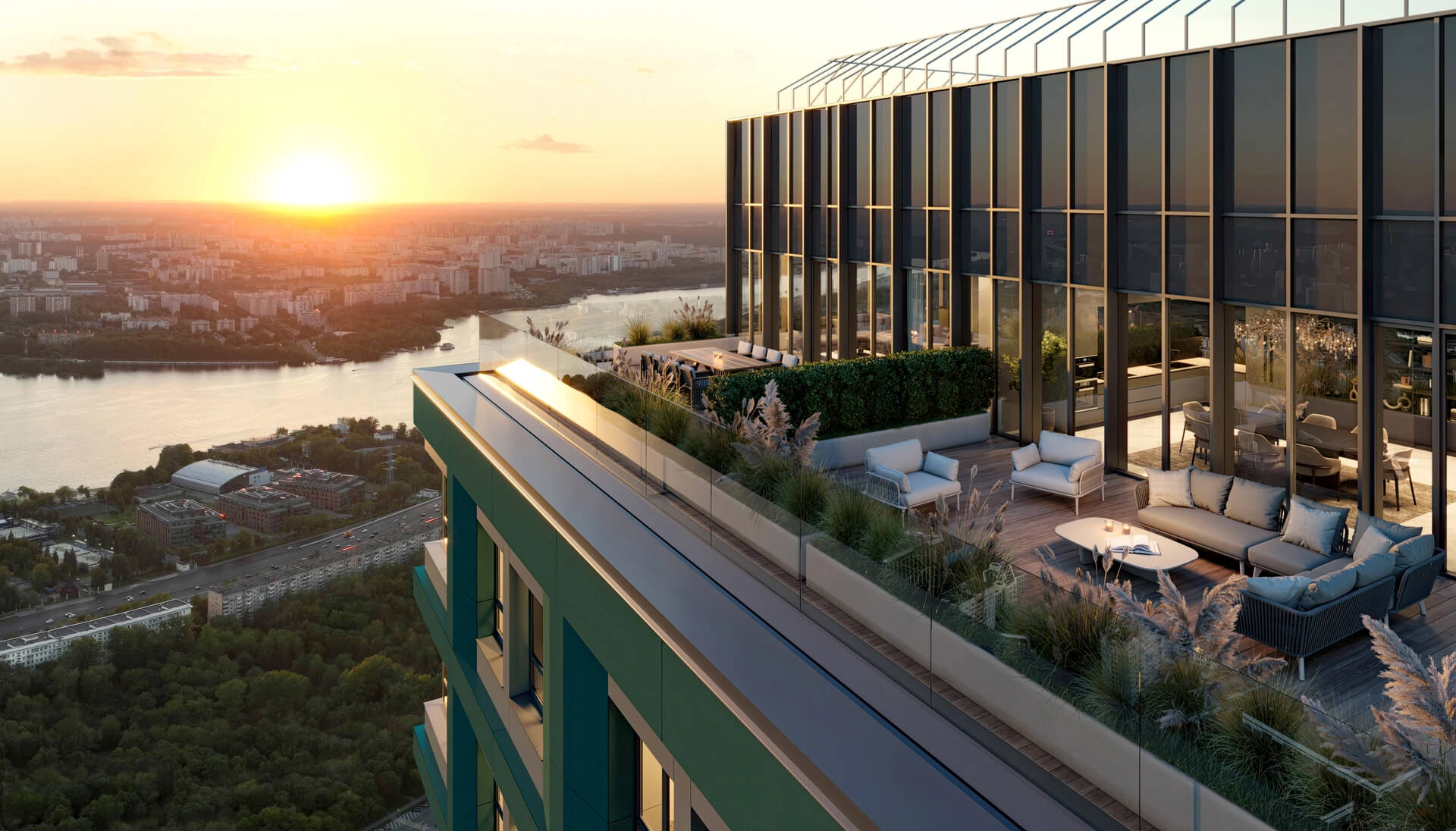 Фасадное оформление построено на контрасте стеклянных и фактурных поверхностей. Используются современные материалы, устойчивые к загрязнению и выгоранию, а модульное остекление обеспечивает естественное освещение в течение всего дня. Пространственные приёмы, такие как выступающие балконы, разновысотные секции и террасы, усиливают архитектурную выразительность. Планировочные решения на уровне корпуса позволили создать видовые квартиры практически на всех этажах, включая виды на Москву-реку, центр города и природные массивы.
