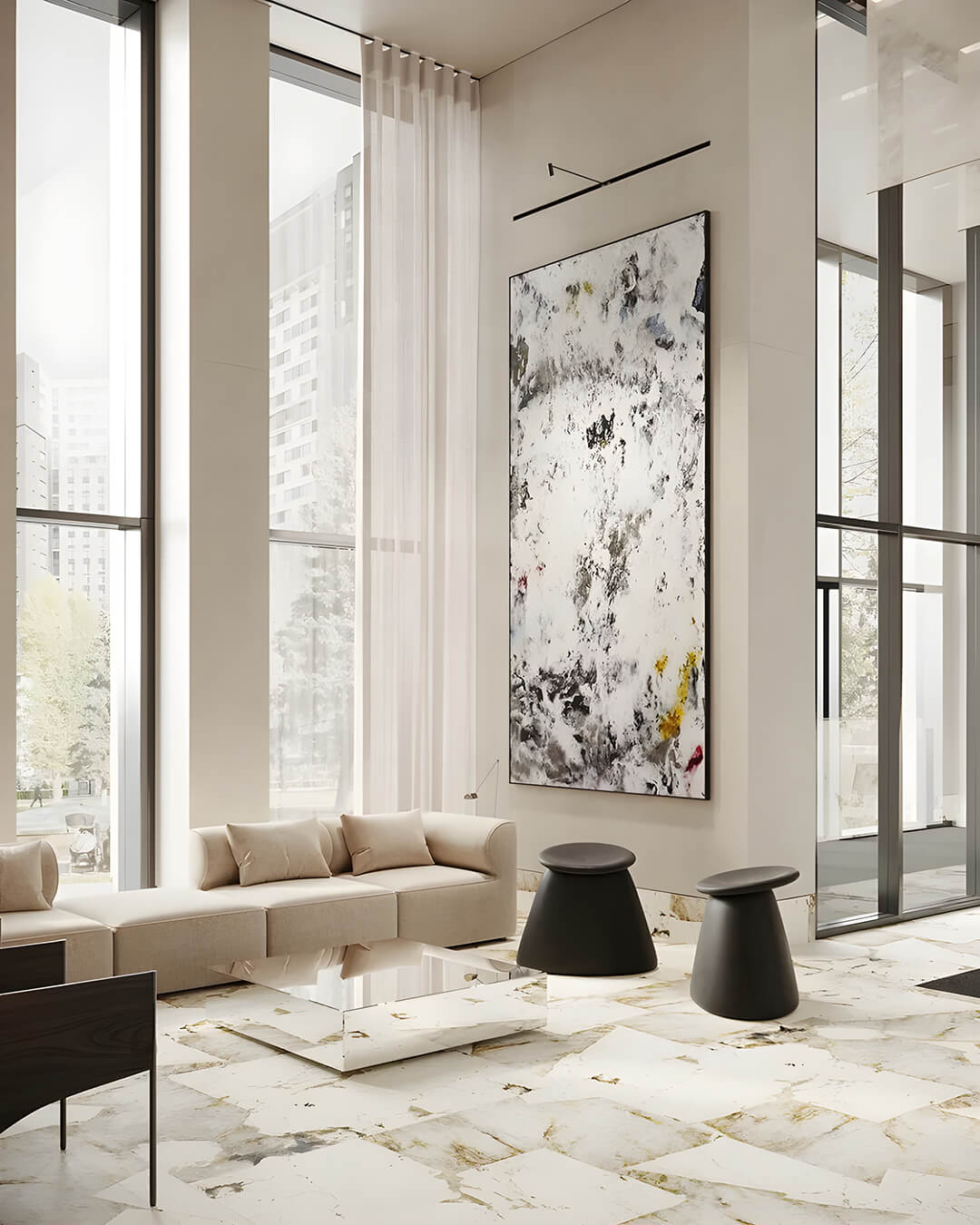 Лобби в Injoy — это полноценные общественные пространства, где продуман каждый элемент: от эстетики до практики. Концепция гранд-лобби реализована в лучших традициях бизнес-класса: высокие потолки, дизайнерская отделка, зоны ожидания, места для деловых встреч и лаундж-зоны с мягкой мебелью и авторским светом. При оформлении использованы современные материалы — дерево, металл, текстиль с тактильными поверхностями, приглушённые оттенки и подсветка создают атмосферу премиального уюта.