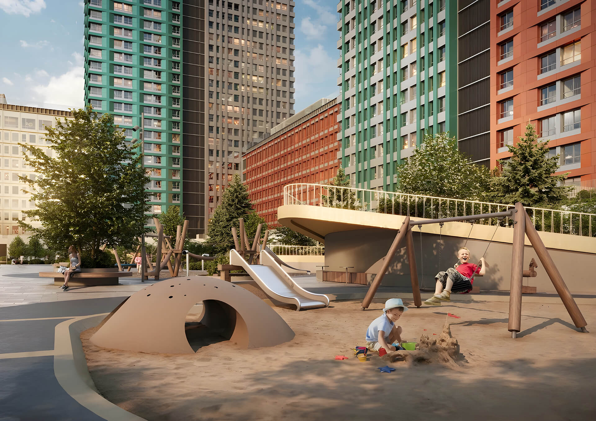 Центральной осью квартала выступает благоустроенный пешеходный бульвар, соединяющий входные группы с коммерческими помещениями и зонами сервиса. Здесь удобно гулять, встречаться, заниматься йогой или просто проводить время с семьей. Мягкое вечернее освещение, тактильные покрытия дорожек и малые архитектурные формы — всё это усиливает ощущение заботы о жителях и формирует высокое качество повседневной среды.