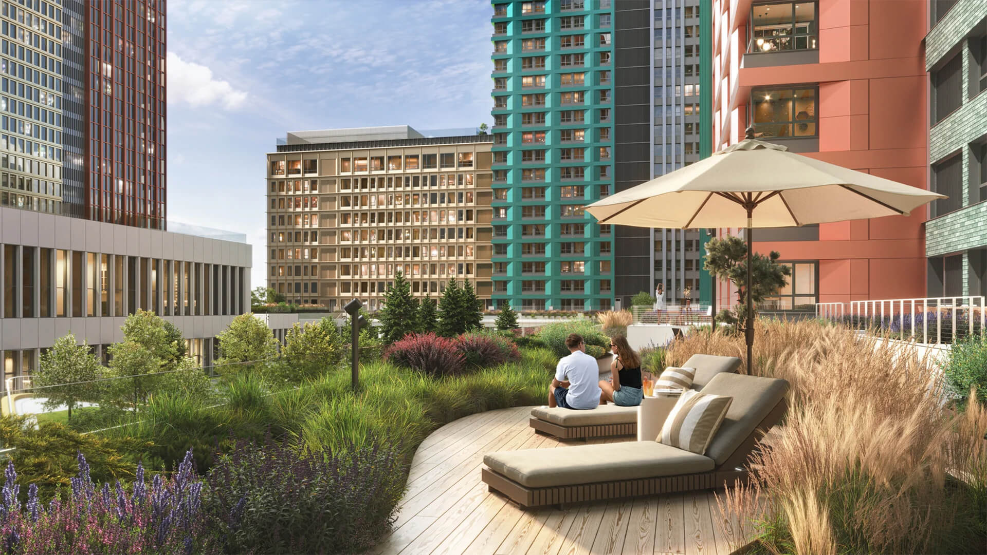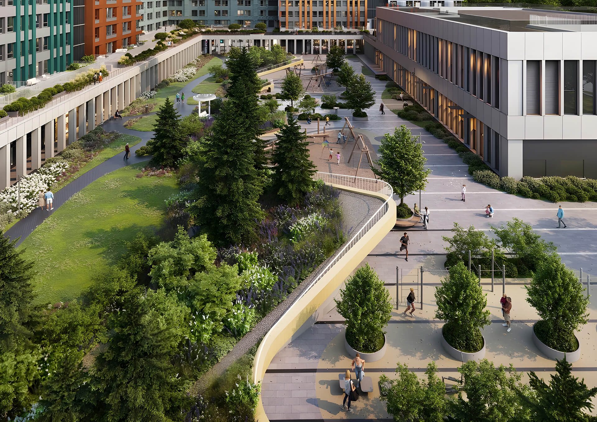 Центральной осью квартала выступает благоустроенный пешеходный бульвар, соединяющий входные группы с коммерческими помещениями и зонами сервиса. Здесь удобно гулять, встречаться, заниматься йогой или просто проводить время с семьей. Мягкое вечернее освещение, тактильные покрытия дорожек и малые архитектурные формы — всё это усиливает ощущение заботы о жителях и формирует высокое качество повседневной среды.
