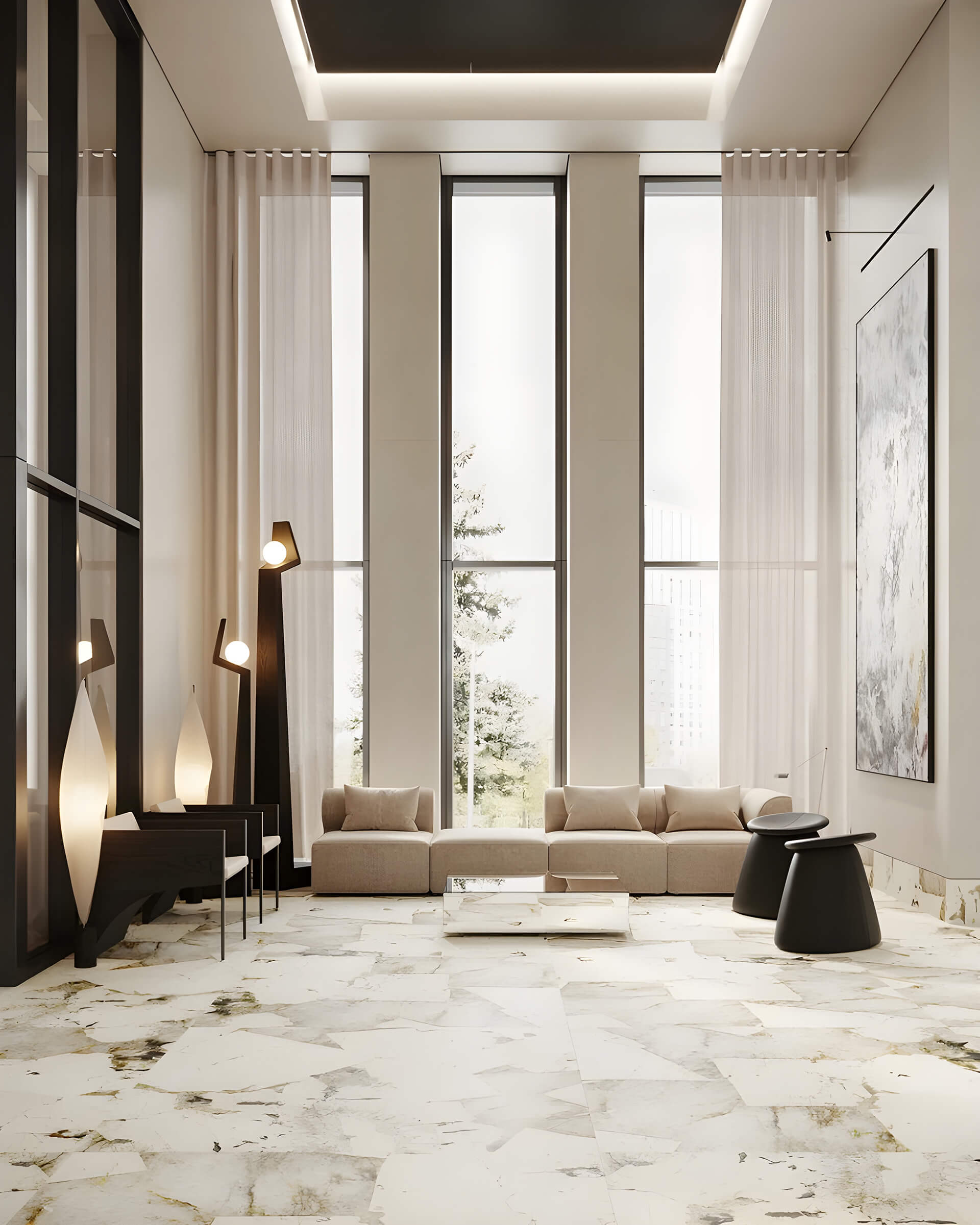 Лобби в Injoy — это полноценные общественные пространства, где продуман каждый элемент: от эстетики до практики. Концепция гранд-лобби реализована в лучших традициях бизнес-класса: высокие потолки, дизайнерская отделка, зоны ожидания, места для деловых встреч и лаундж-зоны с мягкой мебелью и авторским светом. При оформлении использованы современные материалы — дерево, металл, текстиль с тактильными поверхностями, приглушённые оттенки и подсветка создают атмосферу премиального уюта.