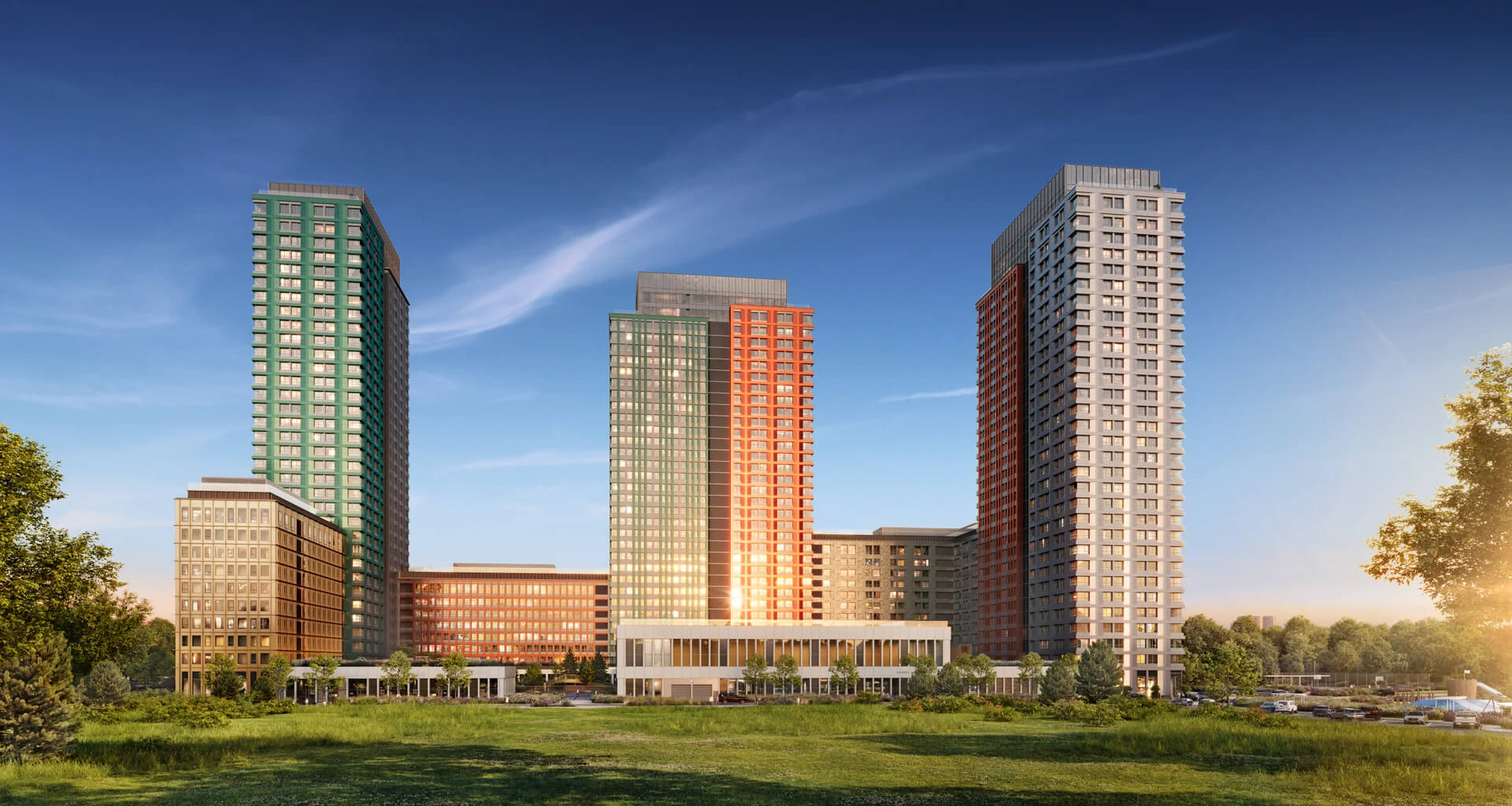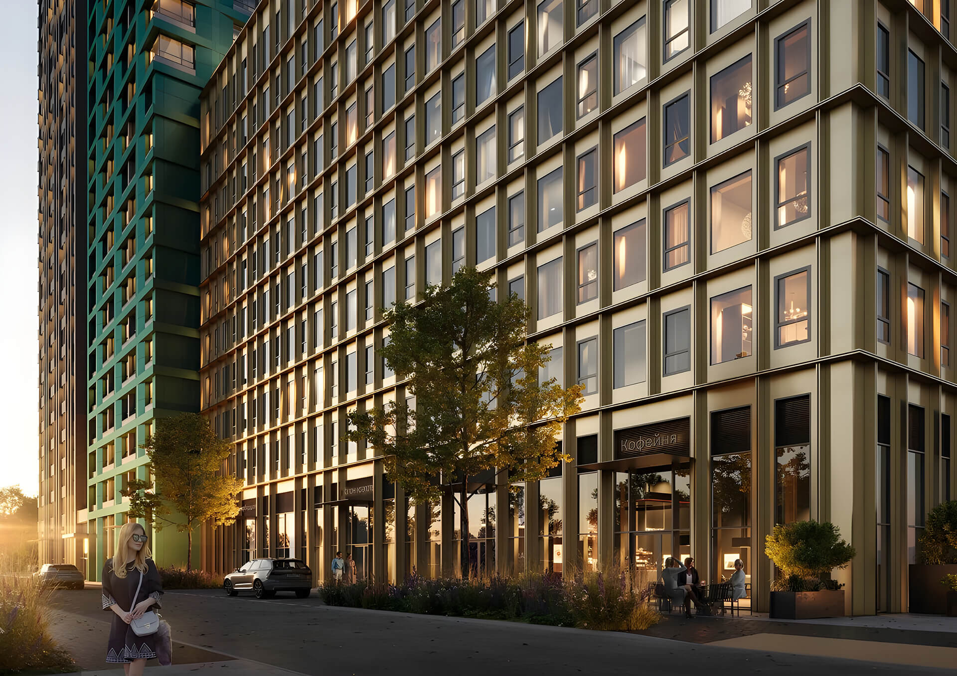 Отдельное внимание уделено входным группам и уличному активному фасаду: архитектура продумана не только как внешний образ, но и как функциональная составляющая среды. Просторные входы, мягкий свет, безбарьерная среда, видеонаблюдение, уникальные элементы освещения и уличной мебели — всё это создаёт не просто жилой дом, а полноценный архитектурный ансамбль, отражающий философию «умного» и комфортного города.